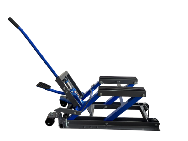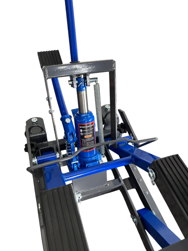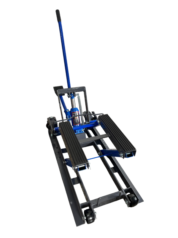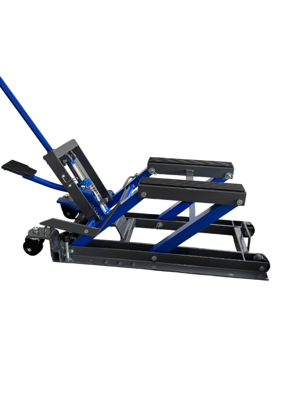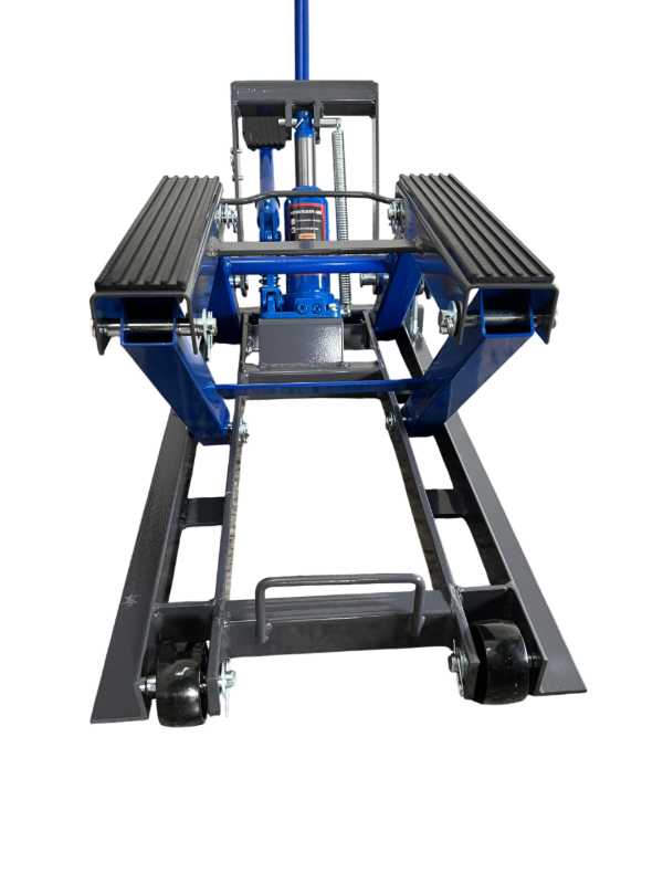 Equipo hidráulico para elevación de motos desde el chasis. Traba de seguridad en la estructura para fijar el equipo elevado. Pedal para elevación y manija para movilizarlo. Ruedas traseras giratorias y frenos en las mismas.